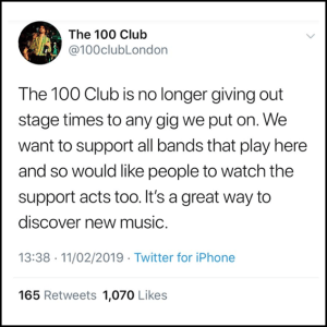 The decision of the club elicited both praise and criticism on social media. On the one hand, users praised the club for throwing its support behind budding, often less-established artists/bands. On the other hand, some argued that this decision would alienate time-strapped patrons, and even jeopardise the support sets. The polarising response to the tweet is perhaps why it has since been taken down. The 100 Club have subsequently tweeted that they will be seeking a ‘middle ground‘.