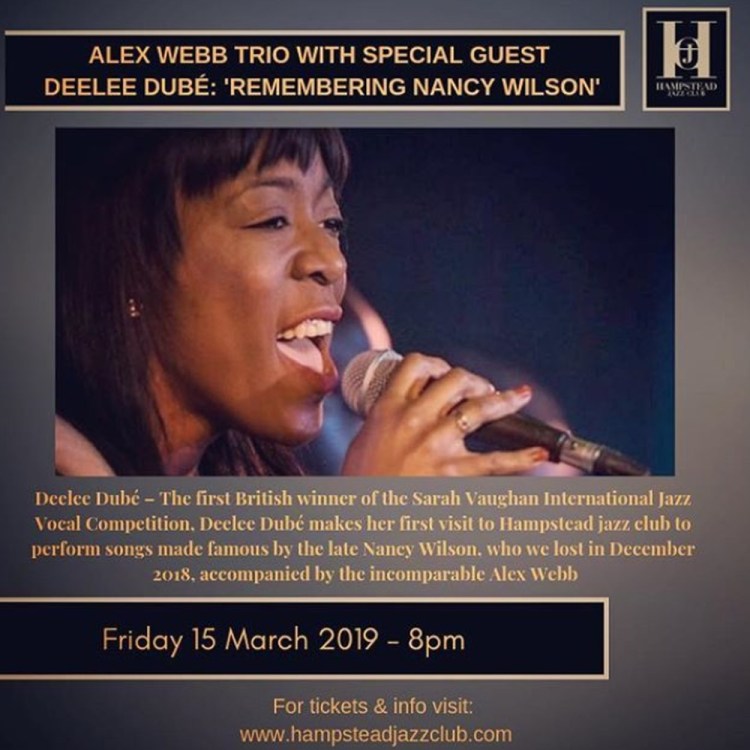 Last night at the venue, four talented musicians paid homage to the late Nancy Wilson, the acclaimed ‘song stylist’ who died last December after a terrific career spanning over five decades. Pianist, arranger, and songwriter Alex Webb – a resident artist at the Hampstead Jazz Club – was joined by double bassist Adam King, drummer Alfonso Vitale, and jazz chanteuse Deelee Dubé. Ms Dubé, who I saw perform at one of the Royal Albert Hall’s live jazz brunches, was the first British (and non-American) winner of the Sarah Vaughan International Jazz Vocal Competition.